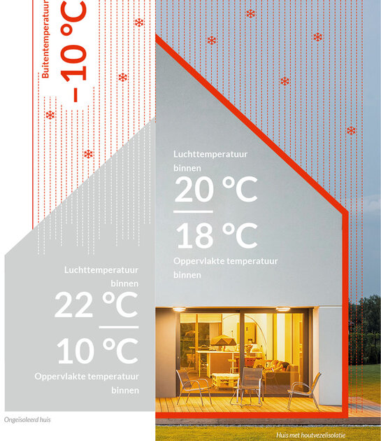 Wooncomfort is het resultaat van het samenspel van kamertemperatuur, oppervlaktetemperatuur van de ruimte, luchtbeweging en luchtvochtigheid. Houtvezelisolatie heeft een positieve invloed op al deze factoren: de warmte dringt de muren binnen, wordt tijdelijk opgeslagen door de houtvezel en weer afgegeven aan de ruimte, zodat deze langzamer afkoelt met een lager verwarmingsvermogen. En dit bespaart niet alleen op uw verwarmingskosten, want we voelen ons het meest comfortabel als de muur- en luchttemperatuur niet meer dan 3° C verschillen.