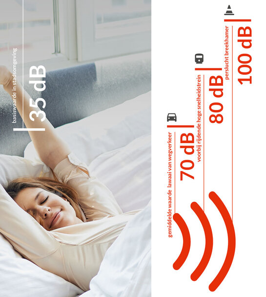 Bij consequent gebruik kunnen onze systemen en producten het geluid in je huis met ongeveer 50 dB verminderen. Dat is enorm, want een verschil van slechts 10 dB ervaren we als slechts half zo luid.